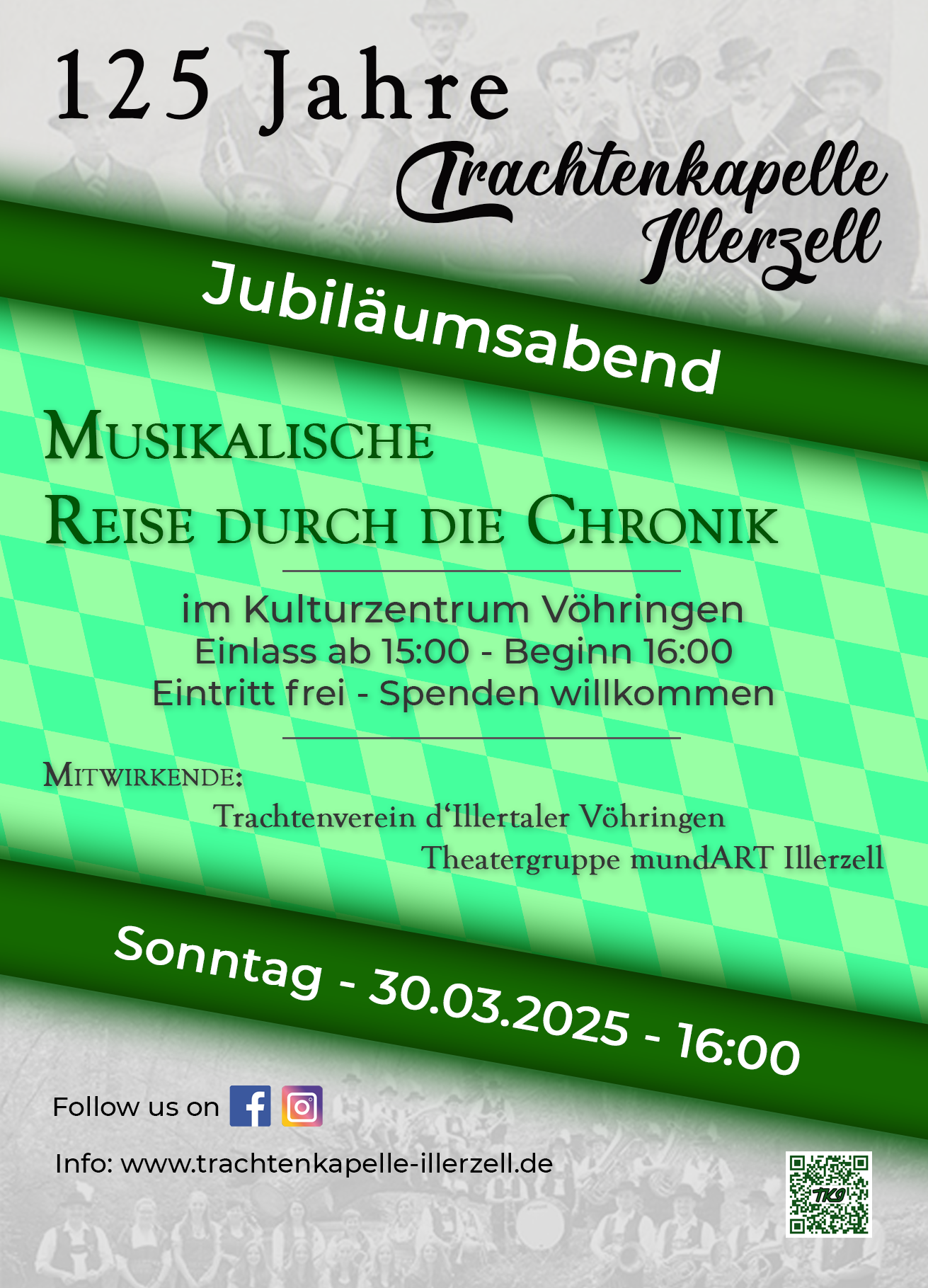125 Jahre Trachtenkapelle Illerzell. Das ist ein Grund zu feiern. Hierzu veranstalten wir am 30.03.2025 ein Jubiläumskonzert. Doch anstatt hierbei einfach durch ein Konzertprogramm zu führen, haben wir uns etwas ganz besonderes überlegt. Wir wollen euch an diesem Abend Geschichten aus 125 Jahren Trachtenkapelle Illerzell erzählen – viele interessante und lustige Anekdoten, aber auch Geschichten, die bewegen und zum Nachdenken anregen. Da wir euch das auf möglichst unterhaltsame Weise näher bringen wollen, freut es uns riesig, dass wir einige Kollegen der Theatergruppe mundArt Illerzell gewinnen konnte, um durch die Chronik zu führen. Weitere Mitwirkende sind unsere Freunde des Trachtenvereins d’Illertaler Vöhringen. Ihr dürft gespannt sein.